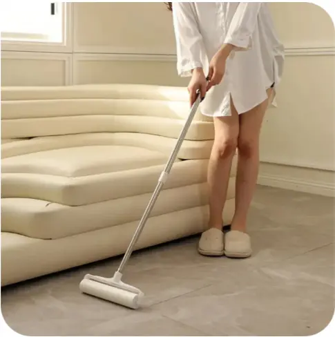 Rodillo adhesivo sacapelusas extensible Uso domestico cortinas, alfombras, sillones etc. Incluye 3 rollos + mango extensible Largo del mango: 1 metro Ancho del rollo: 24 cm Color blanco